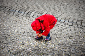 A little girl picking up confetti after an Easter parade. Photo: Eric Tenin of Paris Daily Photo.