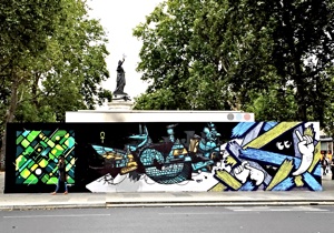 The burnt-out Café des Médias on the Place de la République, now covered in graffiti. Photo: Paris Update