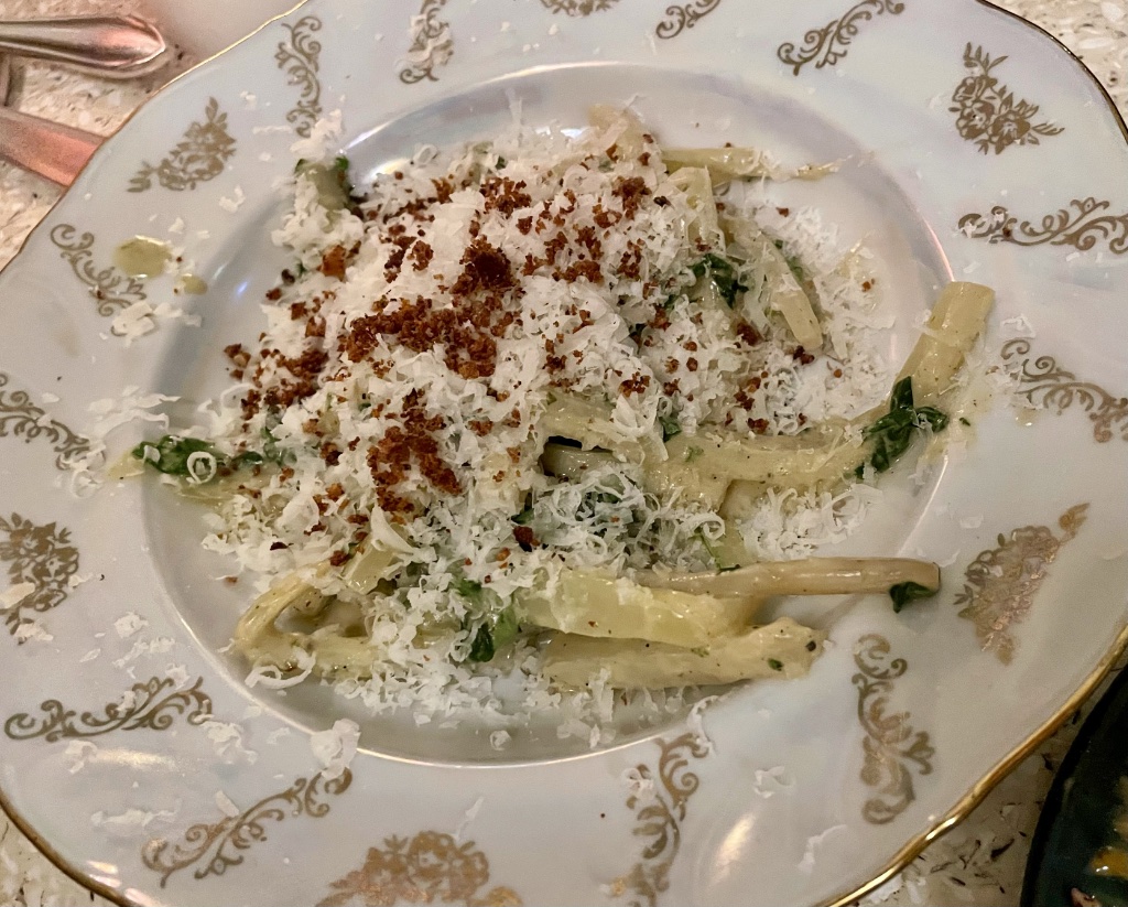 To make sure we got our vitamins, we had ordered two veggie dishes. The first was blettes (Swiss chard) prepared like the Italian dish casio e pepe with cheese and pepper, plus breadcrumbs and chives. So delightful that you’d hardly even know you were eating vegetables.