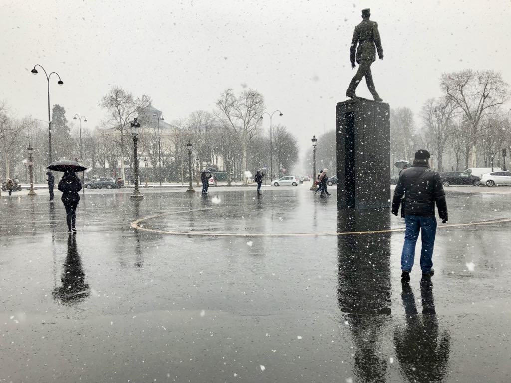Charles de Gaulle strides on through a Paris snowstorm, accompanied by a passing Parisian. © Paris Update