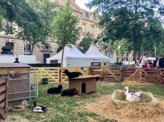 Paris’s Place de la République was transformed into a barnyard (complete with cows, sheep, ducks and geese) and flower-filled meadow last week to raise environmental awareness. © Paris Update