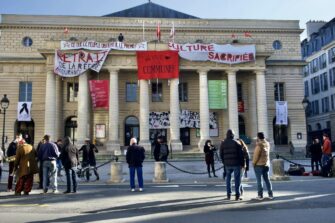 The Théâtre de l’Odéon, occupied, like theaters all over France, by performers protesting the lack of government support for the cultural sector during the pandemic. Photo: Ron Fox