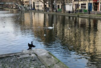 Paris wildlife: a cormorant, a gull and a swan share a piece of the Canal Saint Martin. © Paris Update