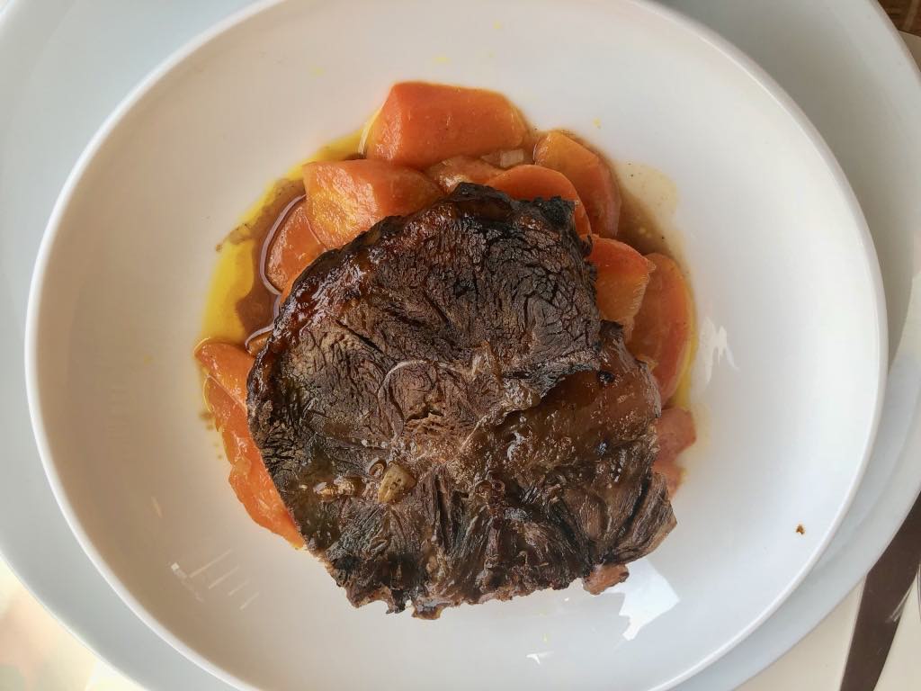 Things went downhill for me after that. My paleron de bœuf (pot roast) was very dry around the edges, although there were a few succulent morsels in the middle. The carrots were supposed to be flavored with orange but tasted more of vinegar.