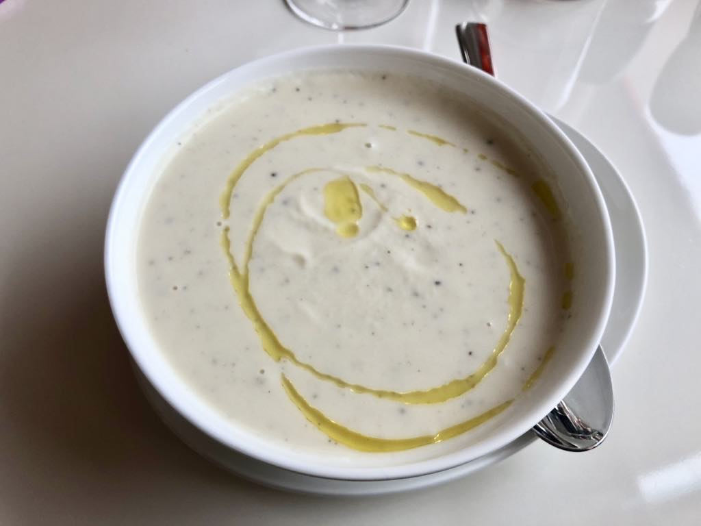 I chose a less expensive option: the set menu for €27, which sounded great to me. The first course of cream of celery soup with specks of truffle, laced with a high-quality olive oil, tasted very good, but it was not hot enough and was too thick for my taste.