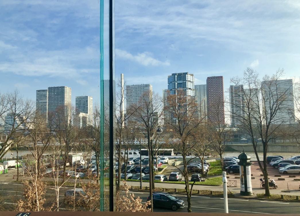 Taking advantage of the curving glass wall of the doughnut-shaped Maison de Radio France and its unusual view of skyscrapers across the Seine, the light-filled restaurant is immediately appealing with its wooden ceiling and space dividers, and bright touches of orange, red, blue and yellow. Music from Radio France is, of course, piped in, a little too loudly for my friends, but it was quickly turned down on request.