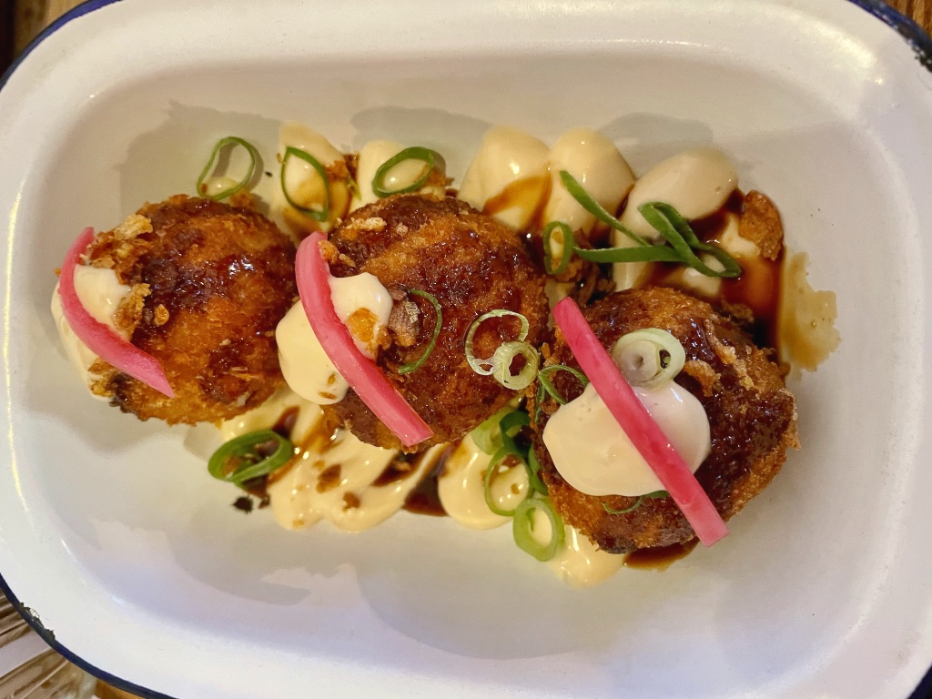 More unusual was the side of three kimchi balls, just like Italian arancini – breaded, deep-fried rice balls with mozzarella – but with kimchi added, served with a mayonnaise sauce. They were perfectly cooked and very tasty, but I would have liked the flavor of the kimchi to be more present.