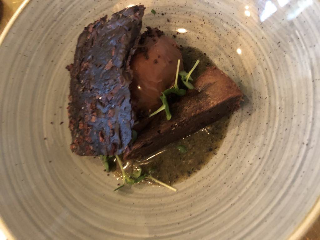 The fish of the day, merlu (hake) was pepped up with lots of acidic flavors from its accompaniments: parsnip purée with yuzu, roasted chestnuts, and sauce vierge (olive oil, lemon with chopped tomatoes, basil and red onion). The little roof on top in the picture is a chestnut tuile.