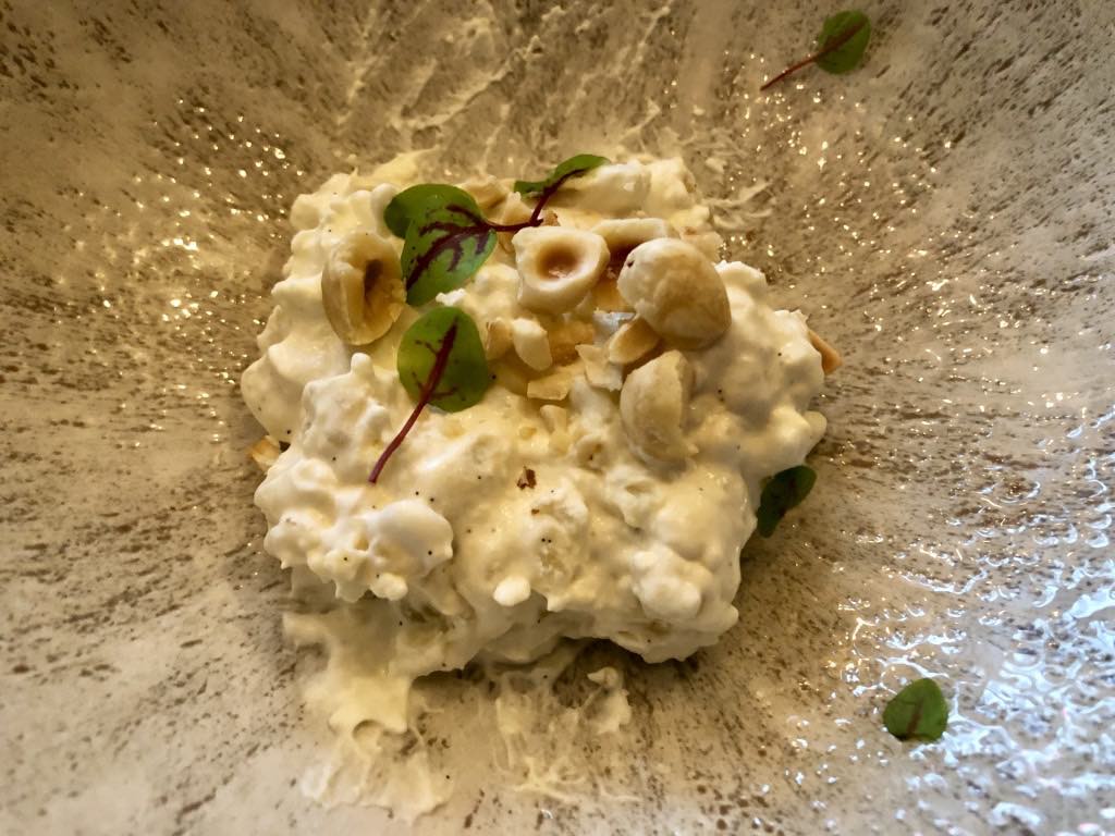 I started with what sounded like – and was – an unusual recipe: button mushrooms, cooked al dente and accompanied by parsley sponge cake, onion flan, pecorino cheese and hazelnuts. You can see from this description what I mean about taking too much trouble. In this case, it was worth it, although the parsley sponge cake didn’t add much except color.