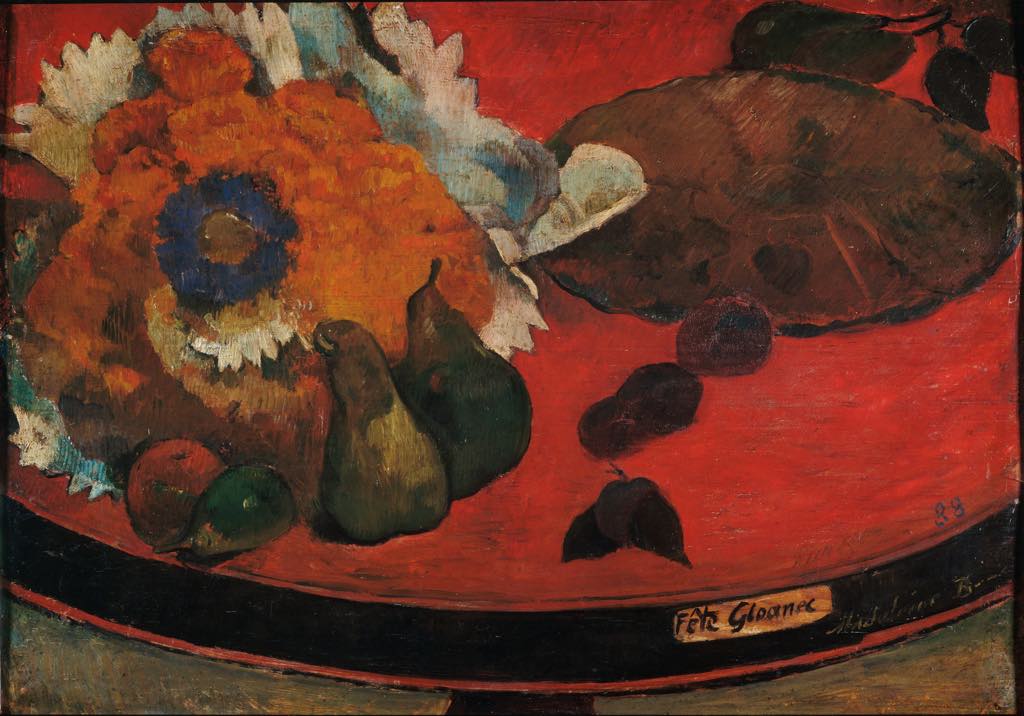 One of the more striking works on show is a bold still life by Gauguin, “Fête Gloanec” (1888). The objects, placed on a blazing-red table, are seen from on high and have no symbolic meanings as in Old Master still lifes.