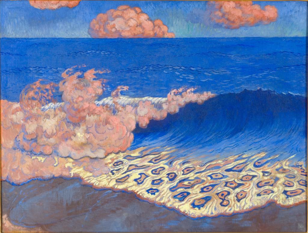 Another work that stands out among the paintings of spindly trees favored by Denis and other Nabis is “Marine Bleu, Effets de Vagues” (c. 1893), by Lacombe (pictured at the top of this page), with its intense blues and pinks and the peacock-feather pattern of the breaking waves on the sand.