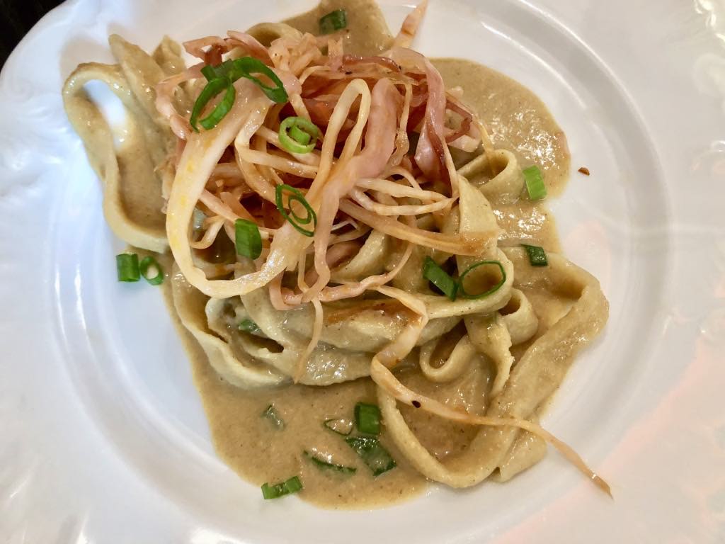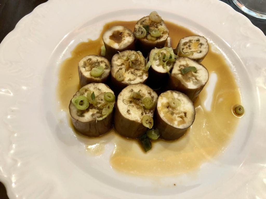 We ordered three starters and loved them all: homemade noodles with nicely contrasting rich and tart flavors of sesame sauce and pickled cabbage; tender steamed baby eggplant with soy sauce and chili oil; and wonderful homemade dumplings with pork and chives – much more delicate than the frozen version offered by many Chinese restaurants.