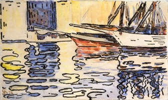 Signac overturned traditional watercolor technique, first making a light pencil sketch, then applying dashes of brilliant, contrasting color, not hesitating to leave blank spaces on the page. Only after the color patches had dried