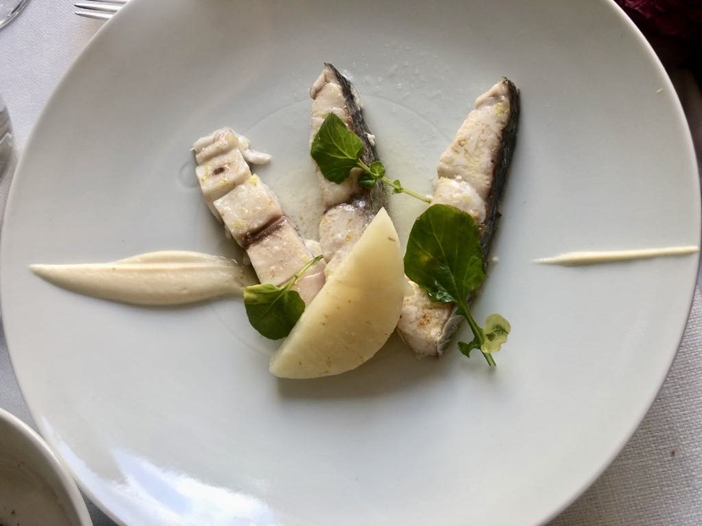 Our lunch (€45 for three courses, with two choices for each) got off to an excellent start with a delicious amuse-bouche of mullet tartare with pomelo and chervil, accompanied by a tiny pecorino-flavored puff pastry.