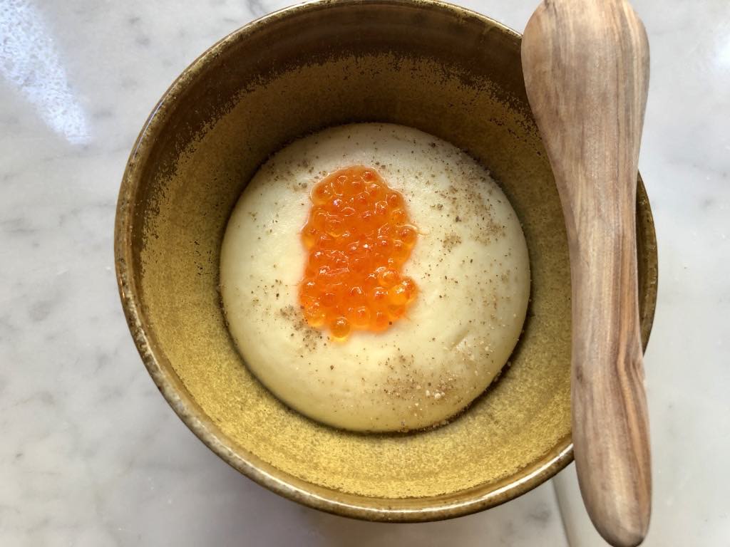 That was not at all the case for the next amuse-bouche, however: a bowl of smoked mashed potatoes flavored with Cancoillotte cheese and topped with trout eggs. Smashing! A little flavor bonus was hidden at the bottom: some finely chopped pickled onions.