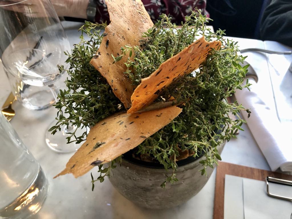The first amuse-bouche we were offered came in a flower pot (shades of Ferran Adrià), with three thin thyme-and- Comté crackers stuck amid the greenery. We promptly pronounced them bland.