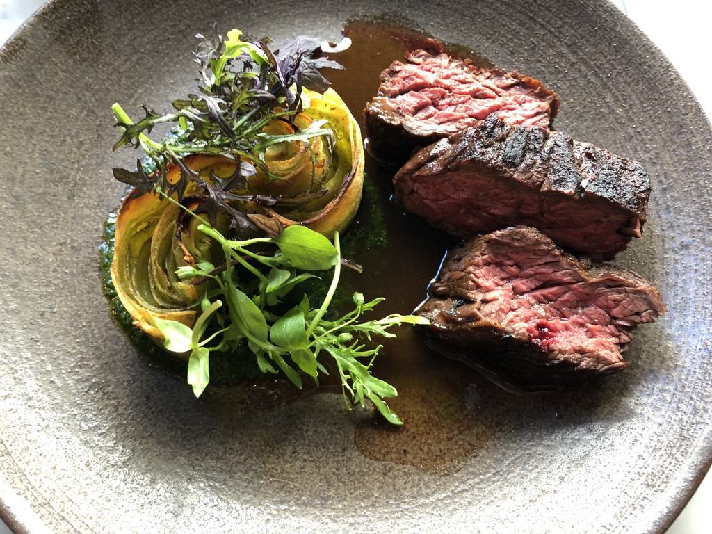 My main course was a flavorful flank steak with an amazing potato concoction. I have no idea how it was made but it seems to have consisted of paper-thin slices of potato with green herbs wrapped around in a pinwheel shape so that they were tender in the middle and crispy on the outside. Fantastic!