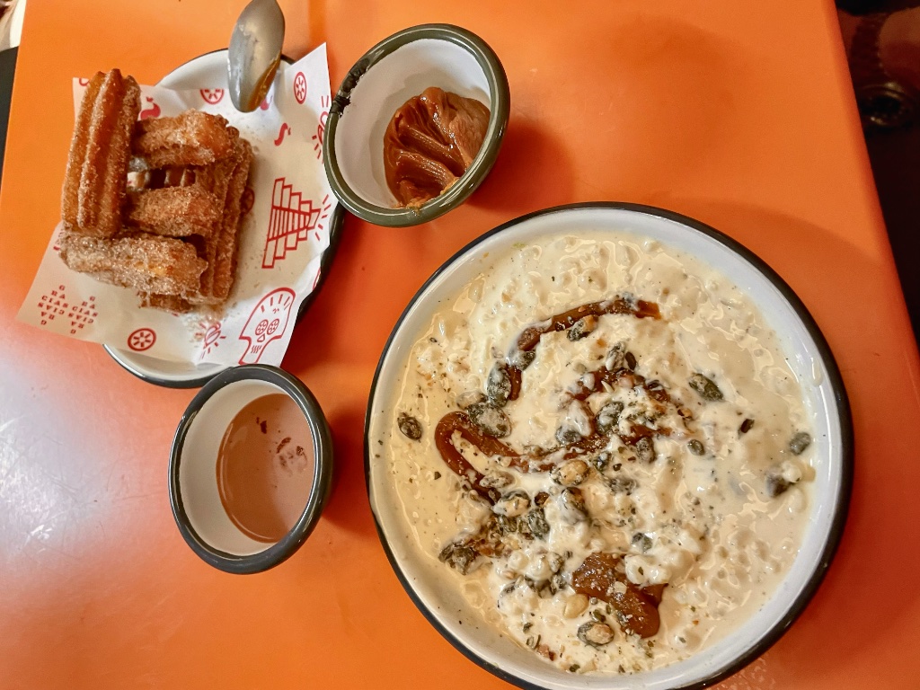 There are only two desserts, both of them far more than recommendable. The not-too-sweet arroz con leche (rice pudding) is balanced by a topping of dulce de leche, with cardamom and tonka beans. adding crunch and a touch of spice.