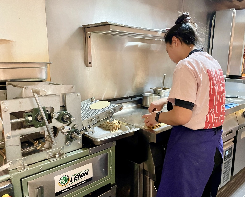 Finally, the announcement changed to “Taco Mesa Ouvert.” Last week, I rounded up three friends and ordered them to be at the door of the restaurant at 7:30pm sharp, since Taco Mesa does not take reservations and doesn’t open until then. I feared a long line of taco lovers, but, no, we were the first and got prime places at the end of the bar, where it bends, allowing for more conviviality and a straight-on view of the tortilla machine, tended by a young woman who fed the dough (nixtamalized in the restaurant) to the machine and quickly dropped the tortillas onto the grill as they rolled out the other side.
