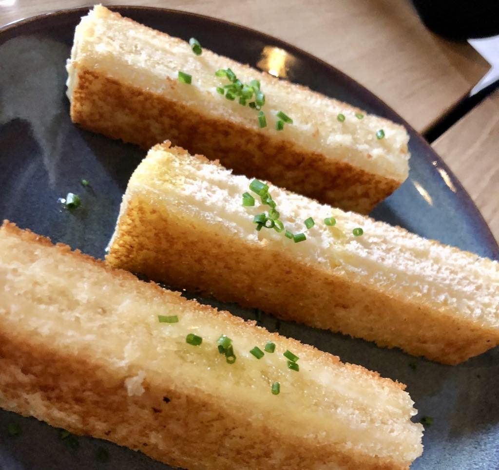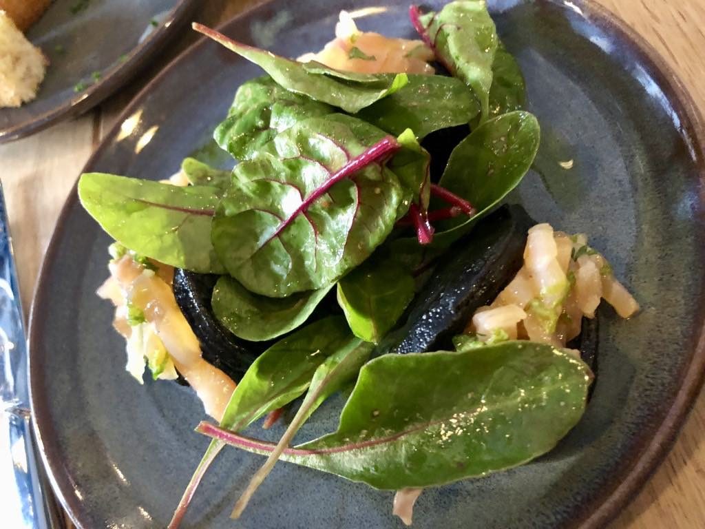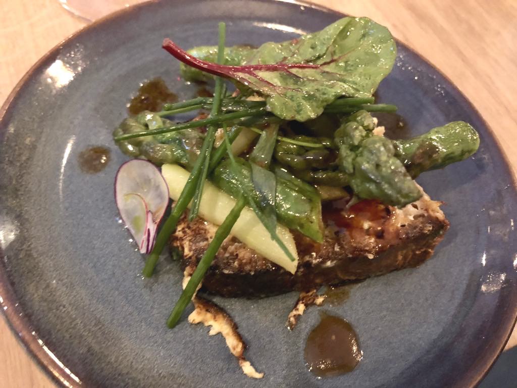 The gua bao bread, blackened with squid ink, was used to make tiny sandwiches with a brilliantly fresh salmon gravlax, though there was no sign of the promised Chinese cabbage.