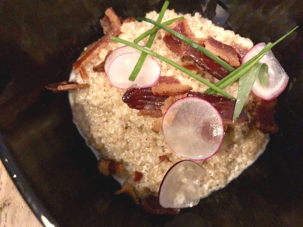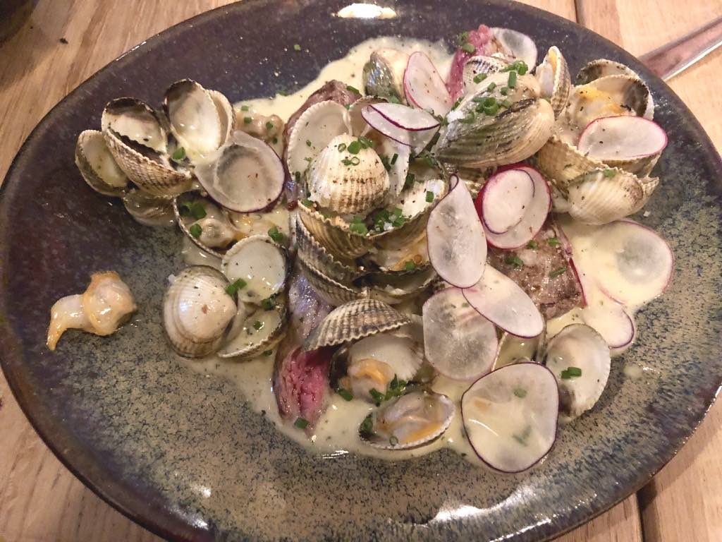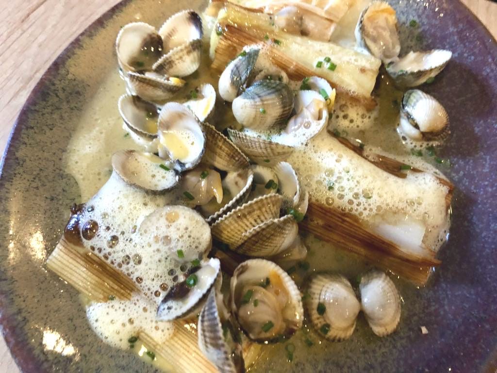 Then came the onslaught of slightly more substantial “main courses.” French toast with asparagus, peas with ricotta and hazelnuts, grilled pork with peanuts, creamy quinoa with bacon, beef with cockles (a surprisingly felicitous combination), cod jazzed up with big salted capers, leeks with cockles, confit egg yolk with carrot and orange, and mixed raw and cooked vegetables. Phew! It was all original and delicious. No complaints were sounded.