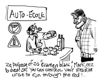 Answer: I could see around the curve, and there was no other car coming, so I said yes – and got it right! But that’s not why I mention this one. The reason the car in this test slide had pulled over was (no kidding) because the driver was urinating on a nearby tree. Anyone who has driven here will recognize this as an accurate, realistic depiction of the kind of situation encountered daily on French roads. And everyone, whether they’ve driven here or not, will be glad to know that the image of the micturating motorist was a cartoon, not a photo.