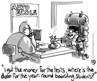 In addition to the expense of driving school, which can cost several thousand euros, the official code (written) and conduite (road) exams cost upwards of €100 each just for the privilege of taking them. Which, for many (if not most) candidates, means for the privilege of failing them.