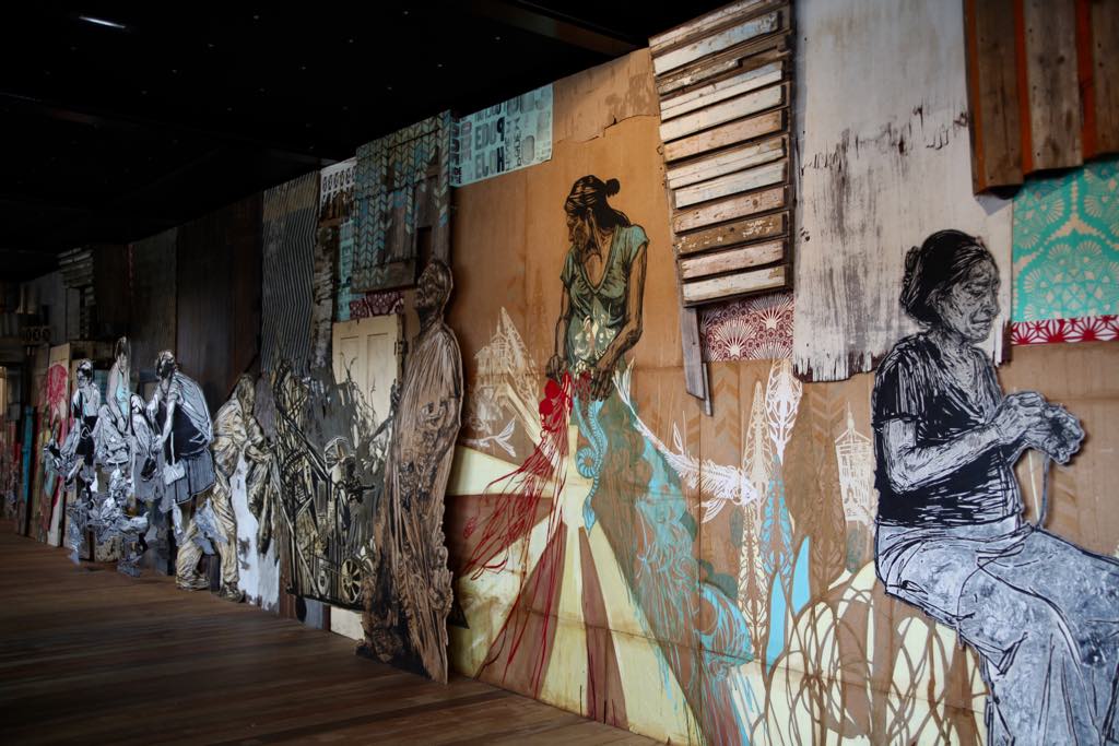 As visitors walk through a tunnel-like space to get from one part of the exhibition to another, they find themselves in the New York subway as depicted by Swoon, looking through the train windows at the great variety of anonymous passengers in their transport trances and stances.
