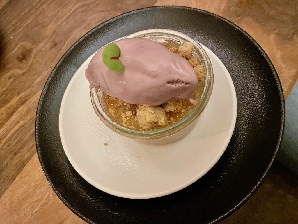 Only two desserts were on offer. The chocolate tart with coffee ice cream was fine, but I didn’t care for the revisited tarte tatin with mezcal (was that the source of the odd flavor?), caramel, lemon cream and purple-corn ice cream.
