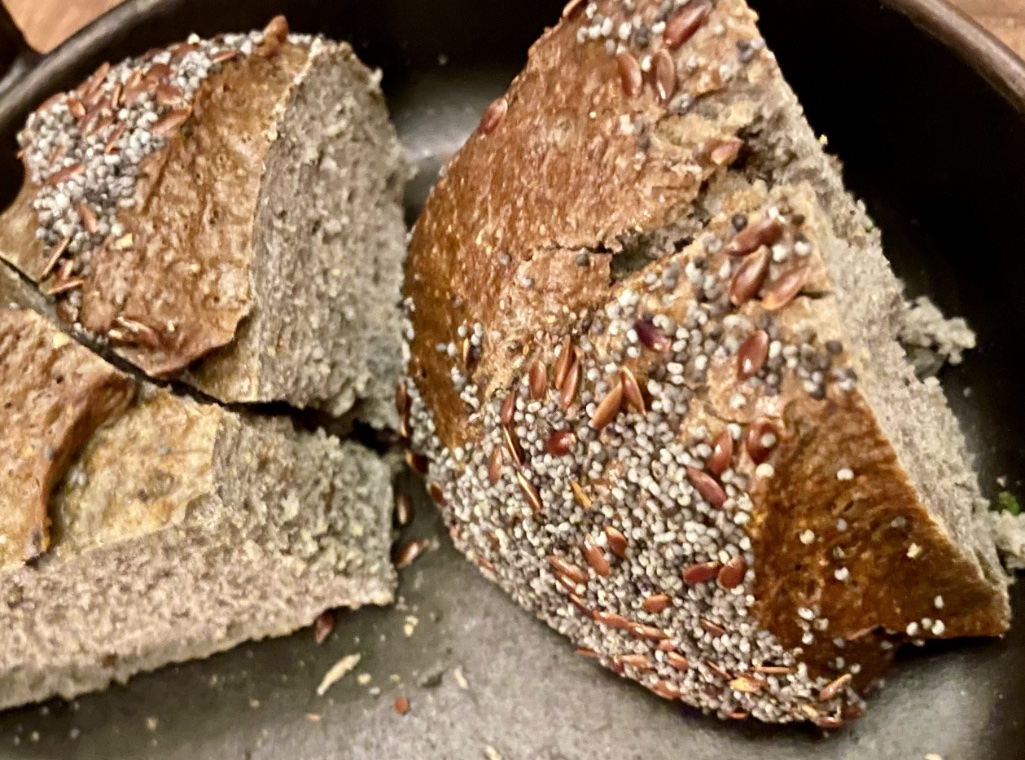 The service, provided by several young men who did not seem to be professionals, was sometimes agreeable and sometimes grudging, as if we were annoying the server by making requests. When the French couple in our group asked for some bread, they were told they would have to wait 15 minutes for the “special bread” to be prepared. Could they just have some ordinary bread? No. They were aghast. Refusing customers bread not only goes against French tradition but also against French law, which stipulates that bread and tap water be included in the price of a meal. We were charged €5 for the special bread, which was actually very tasty: organic black bread crusted with poppy and flax seeds.