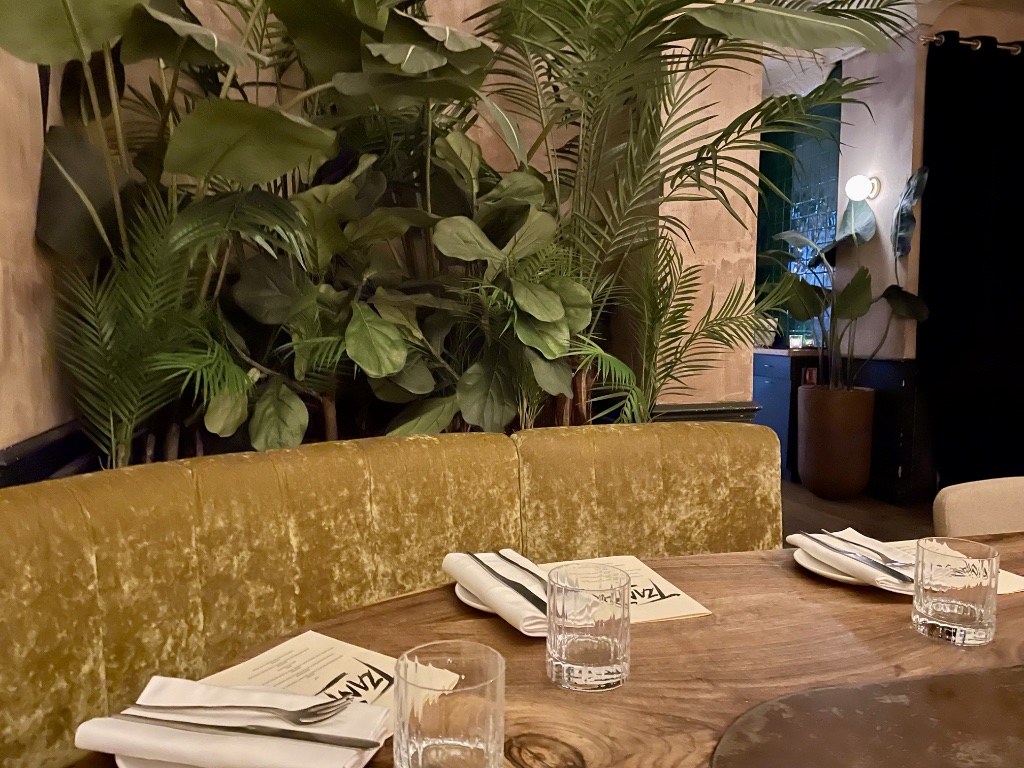 Located on the restaurant-lined Rue Jean-Jacques Rousseau in the first arrondissement, Tzantza has a pleasant decor, with lots of plants (both real and painted on the walls), gold-velvet-covered banquettes and candelabras on the tables.