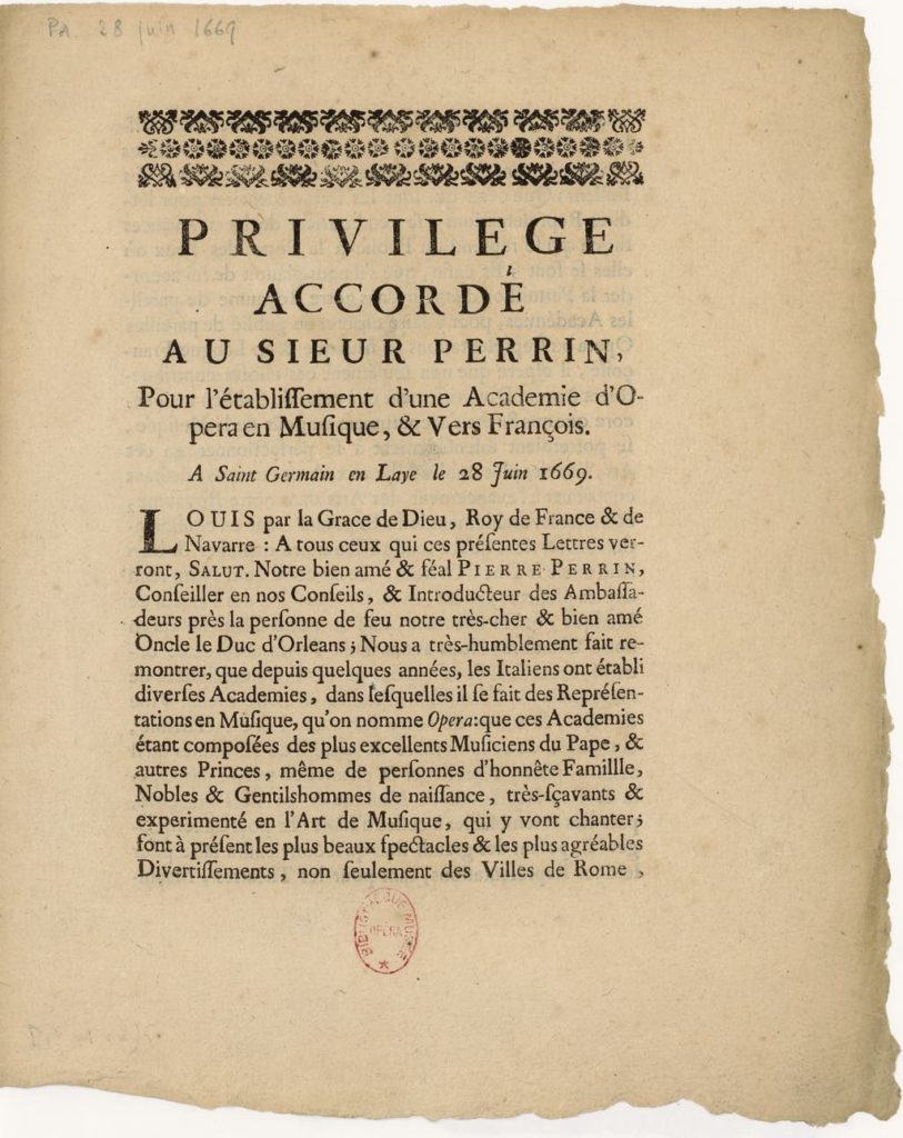 In 1669, Louis bestowed upon the poet Pierre Perrin, who worked with musician Robert Cambert, the exclusive right (or “privilège”) to found France’s first opera academy. When Perrin’s imprisonment for debt prevented him from attending the premiere of his first opera, Pomone, in 1671, the ever-opportunistic Jean-Baptiste Lully stepped in. He bought Perrin’s privilege and established his own Royal Academy of Music.