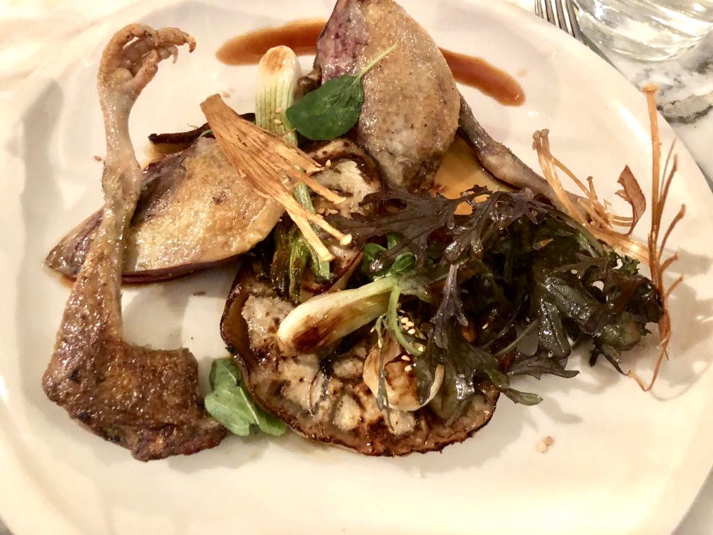 I had the pigeon, cooked very rare, almost bloody. It came with something I hadn’t seen before: dried enoki mushrooms with a deep, earthy flavor. And then there were a couple of slices of marvelous eggplant, tender and flavorful. Both main courses had sauces that begged to be mopped up with the tasty dark bread.
