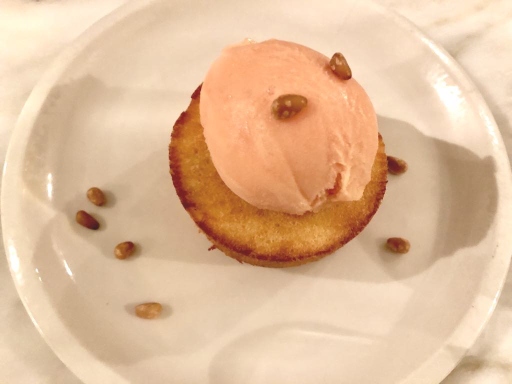 As has happened twice recently, at Berty and Le Bordeluche, the dessert outshone the other, very good, courses. The server talked us into trying the chef’s potato-based dessert, described as “suave” on the menu, made from his mother’s recipe. We were dubious but acquiesced. It was a little cake, amazingly light considering that it was made with potatoes, but it wasn’t very flavorful. The flavor was provided by a scoop of blood-orange ice cream.