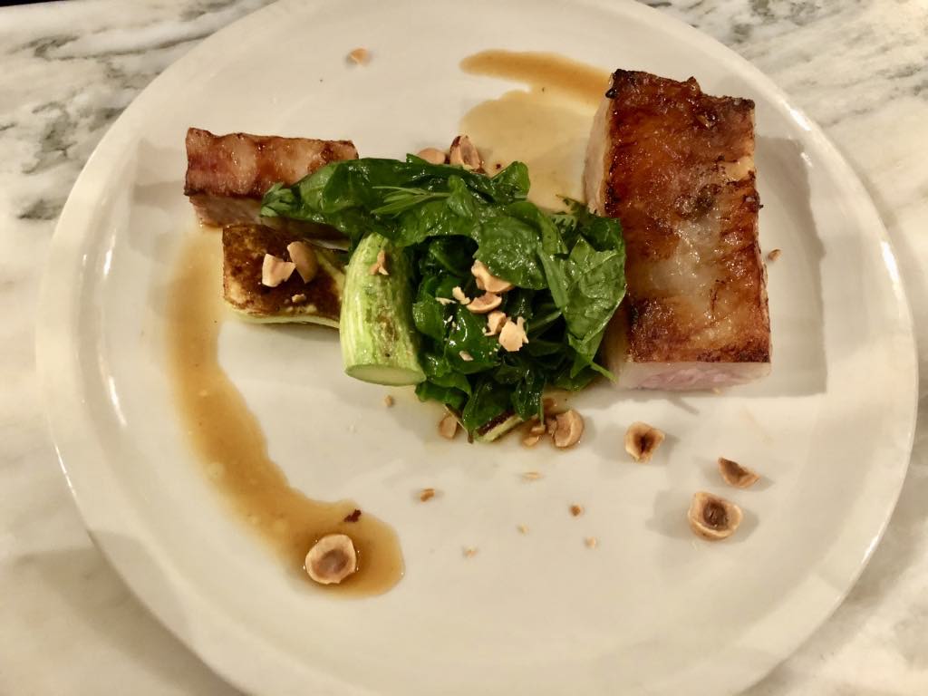 Tom’s main course, veal ribs cooked in beer, was a guilty pleasure for him. Guilty because he doesn’t usually eat veal because of the poor conditions in which the animals are raised in America. He had been told by a French friend, however, that that wasn’t the case in France. I’m not sure if that is true, having seen some horrors on French farms, but everything else about the restaurant convinced me that the veal, too, would be well sourced. Served with lovely spinach and hazelnuts, it was definitely of top quality. Tom cut away the fat, which I thought was delicious, but there was rather too much of it.