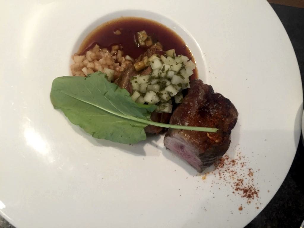 My friend ordered the lamb à la carte. It came in two forms: gigot and confit shoulder. Both were extremely delicious in their different ways. It was served with crunchy cubes of lotus, something I had never tasted before and loved, especially as it was prepared here, and of Granny Smith apple. An excellent gravy brought it all together.